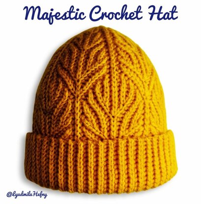 The Majestic crochet hat is made vertically, flat, in one piece. Repeating panels are connected as you go. The Majestic pattern is created using short rows and slip stitches that are smoothly integrated into the ribbing with an optional fold available.