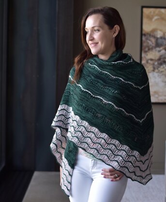 The Malachite Lace shawl was designed to feature the distinct beauty of the hand-painted Fleurville yarn by The Yarn Collective, bringing the complex, saturated tone to center stage. Contrasting stripes in two colors mimic the light and dark layers of stone.