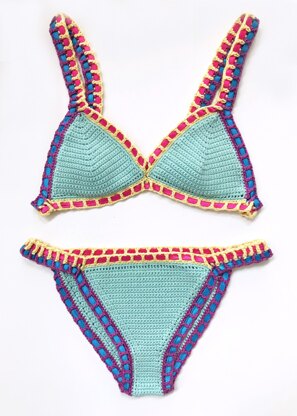 Unleash your creative side and make your own one-of-a-kind bikini with this easy crochet pattern. This bikini is fun, colorful, flirty, with elastic that keeps it very comfortable. The top is easy to wear, either at the beach or with some cut-off shorts. The elastic on the bottoms make a great fit and have moderate to cheeky coverage. This is an Advanced Beginner pattern that has pictures with each row written out. It uses basic crochet stitches, sc, dc and slip stitches. The bikini top comes in sizes A/B, B/C, C/D, D+ The Brazilian Bottoms come in sizes Small, Medium, Large The pattern is written in English only. All patterns are written in US Standard Terms.