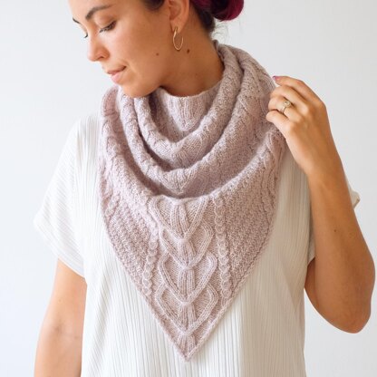 Gentle mallow flowers symbolise health and protection - two things a lot of us are wishing for these days both for our loved ones and ourselves. Inspired by the shape and special meaning of the mallow, this piece is ready to shield off if not the hardships of life, then at least cold and unpleasant weather. This design combines a look of a triangular shawl with an effortless styling and coziness of a cowl. Interesting shaping cuts off the bulk of the fabric at the back neck making it easy to wear under jackets and coats.