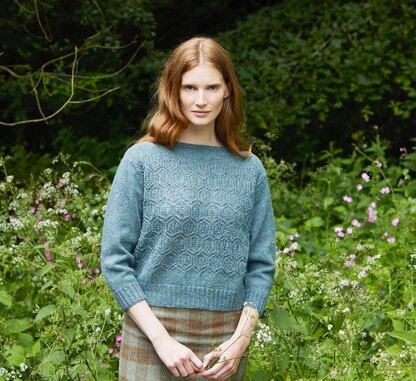 Mallow is a very pretty textured lace stitch sweater from Marie's 'Meadow' collection. It is available in 5 sizes: S, M, L, XL, XXL and is knitted using Jamieson's of Shetland Spindrift. The colour shown in the photographs is Blue Lovat 232.