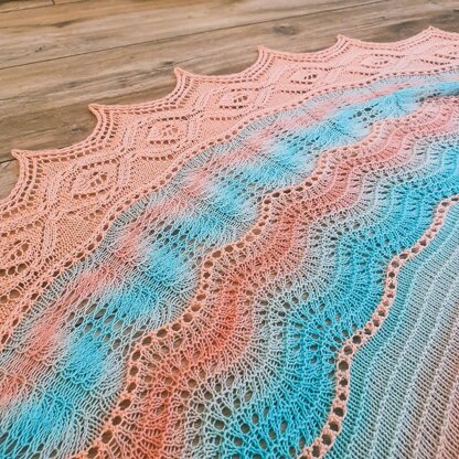 The shawl is worked in four parts with lace pattern in rows from the middle top center to the border.