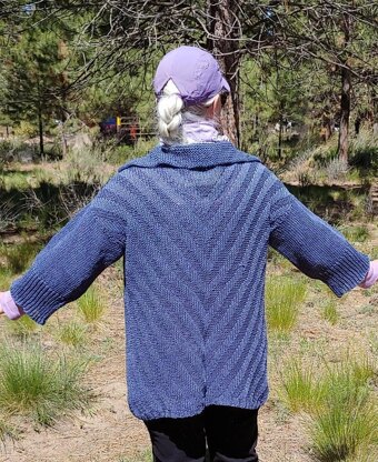Knit from the bottom up, with drop shoulder sleeves and a lapel/collar. This long jacket-style cardigan is lightweight in linen/cotton, or it can be made in wool for more warmth. The only seams are at the shoulders and there are no buttons or buttonholes. It is a nice roomy sweater with 3”/7.5cm of ease.