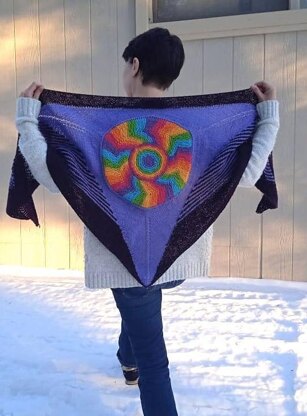 This shawl combines variety of techniques: flat and in-the-round knitting, decreases/increases, short rows and modular knitting. The colorful circle at its center is worked first, and then the rest of shawl grows outwards.