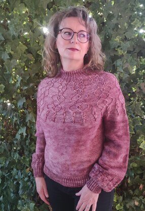 Mandrágora is a round yoke sweater decorated with cables. Worked from top to bottom, starting with the neck, of which you have two options (crew or perkins), it takes a series of short rows (in which the twisted ribbing is continued), to raise the back part a little, body and sleeves are separated at the height of the armhole and the body continues to be worked down. Then the sleeves are made, which have a nice finish of very special cables.