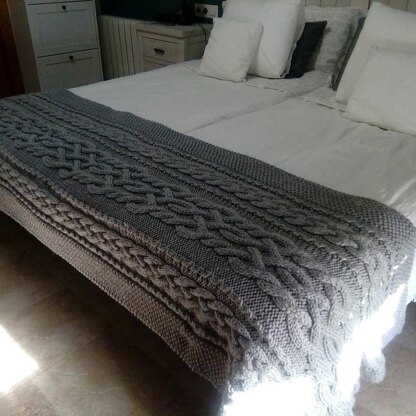 Eileen Blanket is thought to be used as a bedspread for twin beds. It is 1 m wide and 2,35 m long, although you can knit it shorter if you want. I have used aproximately 1600 m of bulky yarn with 7mm and 8 mm needles. You have links to explanatory videos for the stitches a bit more difficult so you can understand it better. I hope you like my pattern.