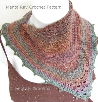 Reminiscent of a graceful manta ray, this crochet pattern creates a beautiful scarflette to add to your wardrobe or gift out to loved ones. It ties likes a bandanna, can be pinned with a shawl clip, and drapes wonderfully.