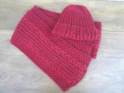 Reminiscence of crimson maple leaves, in preparation for chilly days! A textured scarf and hat duo suitable for either gender, hat features a roll-‐up brim with stitch detail mimicking the scarf.