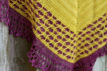 Maragon is a top-down heart-shaped shawl worked in two new delicious colors of Anzula Cloud, Prudence and Temperance. With simple increases and slip stitch patterning it makes the most of the two skeins working up into a generous shawl. The color work is worked one color at a time but delivers a lovely punch.