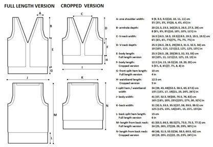 Easy for near beginners. Use one strand of yarn or multiple to make a chunky gauge. You also get to choose between a full length version or cropped version. Garment may be worn with the fabric reversed, as both RS and WS are equally attractive. It is worked as two pieces, flat, and seamed at sides and shoulders. Full length version has a high / low split hem. Cropped version has a deep waistband. This is a close-fitting garment and has approx 0-5 cm / 0-2 in of intended positive ease.