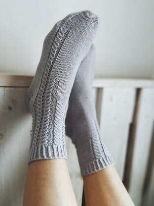 March Socks are worked top down with half twisted ribbing, lace on a cuff. Heel is worked in three stages. A heel is worked with back and forth rows heel flap, short rows for heel turn, and round knitting with decreases for gusset. Foot and toe are worked in rounds while toe is shaped with decreases and seamed with The Kitchener Stitch.