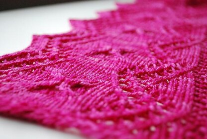 The edging of this shawl combines lace and cables for a striking texture that really shines in a hand-dyed yarn. The shawl is worked from side to side, and it's easy to adjust the shawl's width based on how much yarn you have. Increases and decreases in the garter stitch section gently shape the shawl, while a faux i-cord edging along the top makes it easy to block. The cabled lace edging is both written and charted.