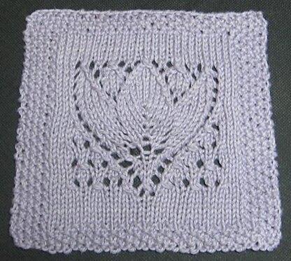 Beautifully detailed lace tulip design surrounded by seed stitch borders is sure to please. It's a little more challenging than it looks. Chart provided, written instructions with chart. Pretty! Rated--Advanced Beginner to Intermediate simple increases and decreases (k2tog, yo, sk2p, ssk), following chart
