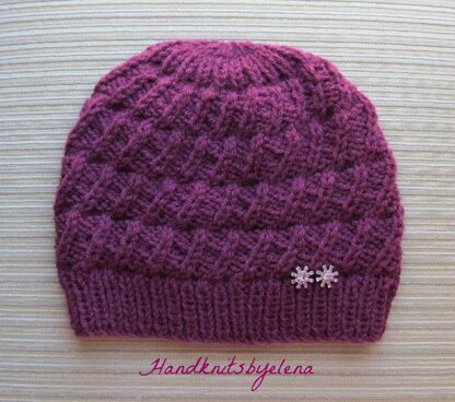 It can be knitted in any medium worsted (aran,10 ply) yarn with gauge of 4.5 sts per 1" in stockinette stitch.