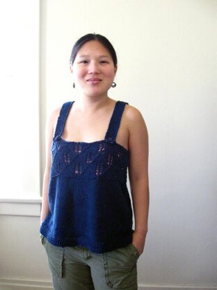 Bring out your inner Marianne Dashwood in this casual tank with an elegant feel. It's worked from the bottom up in the round with seed stitch hem and straps and an allover leaf lace motif on the bodice. The worsted weight cotton/acrylic blend works up quickly with plenty of drape. The bodice is lined with a contrasting sport weight yarn in linen, adding a splash of color. The straps are lined with ribbon to prevent stretching and attached to the tank with four buttons. Pattern includes chart and written instructions for lace and a schematic. Pattern was tech edited by Joeli Caparco.