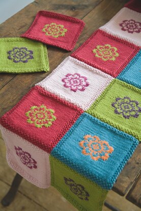 The coasters are knitted in stocking stitch, using the Fairisle technique for the marigold motif, wth a moss/seed stitch border, to ensure the coasters lie flat.