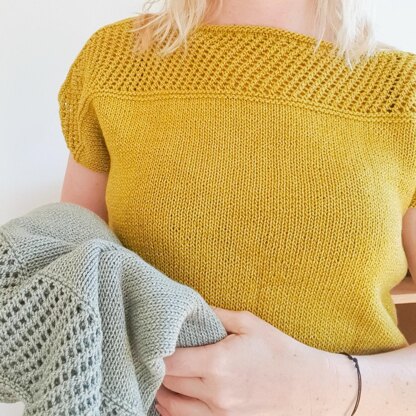 The Marigold top is a light cotton-wool top, which makes for a quick and easy summer project. It is knit in the round from the bottom up until the armholes, where front and back are split and worked separately. The top half of the upper body has a delicate diagonal lace pattern, which gives it an airy and light look. The lace pattern is mirrored on the lower border with a small eyelet pattern.