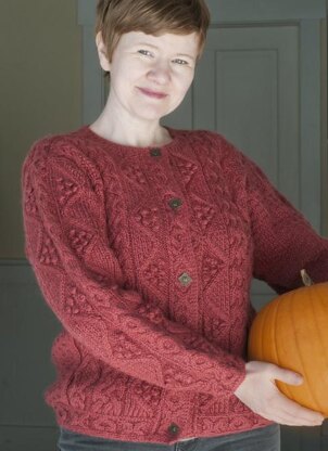 This standard length, loose fitting Aran Cardigan is worked from the bottom edge to the underarm in one piece. The body is split at the armholes, and the upper fronts and back are worked back and forth separately. Button bands are knitted as part of the garment. The buttonholes are worked in the "O"s of the OX cable. The sleeves are knitted from the cuff to the armhole and sewn in . Saddle shoulders join the front and back. The neckline ribbing is then picked up and knit. Luscious cables will keep your interest while you knit.