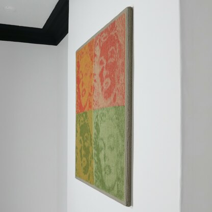 The cushion uses two colours and only one colour is used on each ridge of knitting. The wall-hanging uses four colours and sometimes has one colour on a ridge and sometimes two. One of the photos shows the four colours that were used for one of the hangings. These might seem surprising when you look at the four resulting squares when you look at the wall-hanging from directly in front.