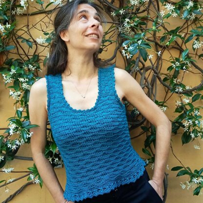 The tank top is worked on flat in round-trip turns with an elastic stitch that gives the model a snug fit, but being a full size pattern, you can choose the size and fit you prefer.