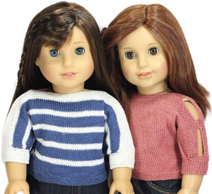 Knit a trendy summer top for your 18 inch doll. This a boatneck and baggy style top with a three-quarter length or short dolman sleeve. The sweater closes with buttons in the back. The peepholes on the sleeves add to the summer flair.