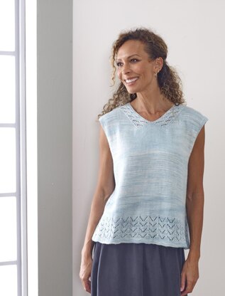 The Maritza Vest is a pretty sleeveless top with lace at the bottom hem and along the shaped front neck. The body is worked in the round to the underarms. The front and back are then worked flat separately to the shoulders which are joined with a 3-needle cast off. Armhole edgings are picked up and worked in the round in garter stitch.