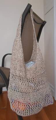 Extremely light-weight, yet very sturdy, this bag is worked mostly in the round in an easy 4 row lace pattern. The bag can be folded and carried in a purse.