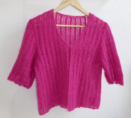 This lady’s lacy rib, V neck jacket has elbow length, set-in sleeves. The body is worked in one piece to the armholes meaning there is less sewing up and the lacy pattern continues without seams. The lower edge has a subtle scalloped effect. The jacket fastens with a single hook and eye.