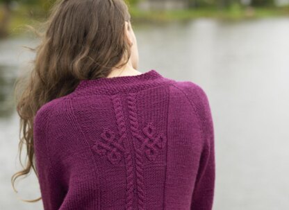 Put a little swing in your step with this body-skimming cardigan. Flattering to any body type, a closed-cable motif graces the upper back and two mirrored cables frame a soft gusset. The moss stitch bands frame the front, with a single dramatic button placed near the sternum.