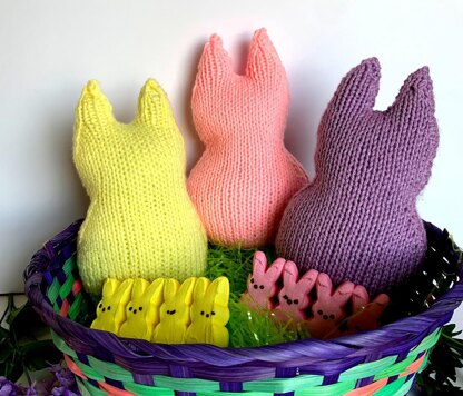 So soft and squishy, no marshmallow inside, just a soft pillow toy! This replicates those wonderful “marshmallow bunnies’ treats we see in stores at Easter. What a great idea to add this soft bunny to the Easter basket along with edible marshmallow bunnies! Kids love this, so make lots in various colors. Not just for Easter, these make a cute gift all year round! Approximately 9 1/2 inches high. Use worsted weight yarns, knitting needles US # 8.