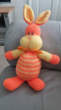 This bunny is called “Marshmallow” because they are fluffy, pink and white. This pattern incorporates intarsia colour-work to make the ears. Designed by Amanda Berry @fluffandfuzz, the bunny is knitted in acrylic DK yarns on single pointed needles (not in the round). For confident beginners and above, other techniques used include casting on and off, knits, purls, increases and decreases, knitting stripes, picking up stitches along an edge, and seaming to finish.