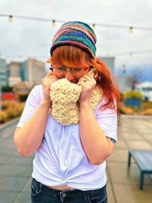I know you’re supposed to write something clever here, or witty, or even inspiring, but I just don’t ever know what to write when describing my designs so that it doesn’t sound like a food blogger trying to use every SEO/Keyword possible. So here is the Marshmallow Cowl. I had bought a shit ton of Lion Brand Thick and Quick Bonus Bundles in Fisherman and then my partner said he needed a cowl for when he goes to the store on the electric scooter, and this big ass cowl was born. I love the stitches combo because it makes them kinda look like marshmallows and I freaking love marshmallows.