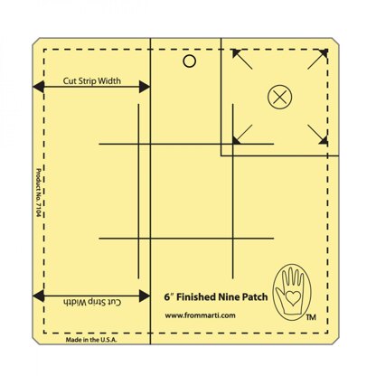 Make 6-inch finished Nine Patch blocks with this ruler! What could be easier than making Nine Patch blocks? Making Nine Patch blocks with From Marti Michell Nine Patch Rulers! Available in 7 different sizes. These innovative rulers improve on strip techniques as they guide you in cutting very accurate strip widths. (What size strip would you cut for a 5" finished Nine Patch? No need to know, we did the math!) Next, you get perfect “second strip” cuts and can use the tool itself to confirm exact finished block size. Fussy cut single squares or block size squares, too. Deeply etched amber acrylic.