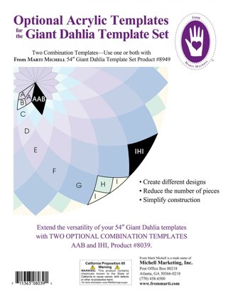 Marti has seen how popular the center and edge treatment options are in her classes. These add-ons to our Giant Dahlia template set save time and fabric. With the Combined AAB template, only 8 seams meet in the center and 8 "B" pieces are appliqued onto them. The other 8 pieces are sewn into the arcs. The Combined IHI template offers a new design option and saves one fabric.
