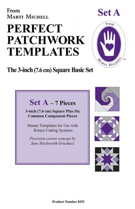 7 clear acrylic templates. The templates in Set A are based on a 3in (7.6 cm) finished square and its most common component parts. Those in Set B are the same geometric components of a square, but are based on a finished 4in (10 cm) square.\n\nAny patchwork block you can make with Set A templates can also be made with Set B; it will just be larger. Every template has its own permanent identifying number. The collection of patchwork blocks featured in Volume 1 is keyed numerically for use with the corresponding Perfect Patchwork Templates. The versatility of the templates means you can make several block sizes from each set of templates.