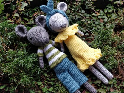 These Dolls have a total length of about 41 cm (using Aran weight yarn) Included patterns: - Mary - Mike - Heart Play around with different colors and create your unique Mouse Dolls. The pattern is written in English (US) using US terminology.
