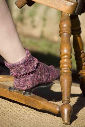 These toe-up socks with a short row heel provide fun nostalgia and a funky picot ruffle for those of us who love our Mary Jane shoes. This pattern is ideal for using every last bit of precious hand-dyed yarn. While the Mary Jane socks are designed with a round toe and short row heel, an experienced sock knitter should be able to substitute whatever heel and toe suit the wearer best.