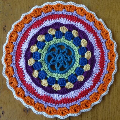 This mandala was 'born' whilst I was on a knitaway holiday in Buxton and is named after Mary Queen of Scots who visited Buxton no less than 11 times whilst in her 19 years of captivity. I thought it rather fitting to name something colourful after such a colourful queen.