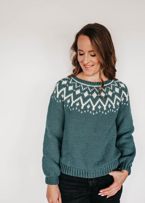 The colourwork in this sweater is written in chart form with instructions on how to read the chart. The remainder of the pattern is written in US English crochet terms. If you have made a solid colour, circular yoke sweater before you can make this! If you’ve done colourwork with floats before - you can make this! No colourwork experience needed. All patterns are written in US crochet terms.