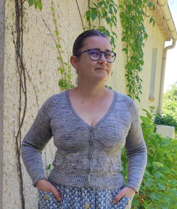 Masula is a small, very feminine cardigan with a wide V-neck, pretty lace at the bottom and fancy ribbing on the body and cuffs.