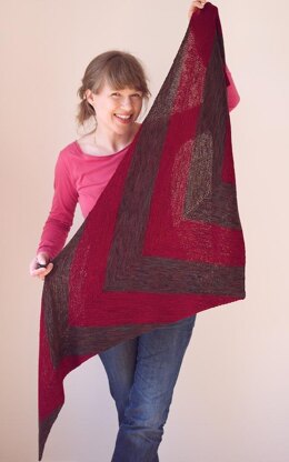 I just love the “We’re Different"-Grab Bags from Rohrspatz & Wollmeise: Depending on which kind you choose, you will get a combination of a multicolor and a matching semisolid, hand-picked by the dyemaster herself, who has an unmatched sense of color. What shall I say? I was really surprised when I saw that she teamed up a softly variegated brown-grey with a bold and warm red. I just had to give it a try and get my knitting needles moving! So here’s “Match + Move", a shawl designed to show off the perfect Wollmeise color combination and use up (almost!) an entire grab bag of yarn. My shawl weighs 286 Grams. The unusual construction results in kinked stripes that look really interesting when you wear it. The knitting is plain garter stitch and very relaxing, and the shawl is so big and comfy, it is just a dream to wear.
