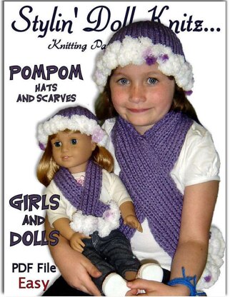 Knitting Pattern , Matching PomPom hat and scarf. Fits girls ages 4-10 and 18 inch dolls