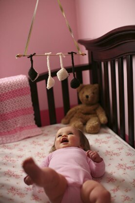This fast to knit mobile is interesting to make and ideal for an infant. The basic colors appeal to an infant's developing vision and the organic, non-dyed materials and shape identification will appeal to the baby's mom! Purchasing the yarns used in this sample allows a knitter to support the Shetland Islands' natives and the perpetuation of the Shetland sheep breed, too!