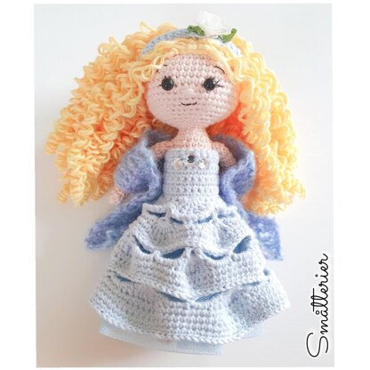 Mathilde the Princess is made with basic amigurumi techniques, head and torso in one piece, and then the four limbs are sewn on. Her hair is attatched to a wig cap, and the pattern includes tutorial on how to make curls. The doll measures approx. 16 cm (6.3 in), and she has a whole wardrobe of clothes to choose from, including dresses, trousers, shoes, tops and accessories.