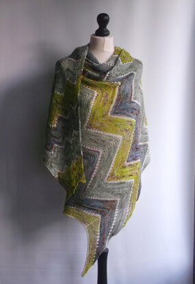 This shawl/wrap is worked sideways, starting at the short end, increasing outward to create an isosceles shape. An eyelet line separates each section of garter stitch as the garment grows.