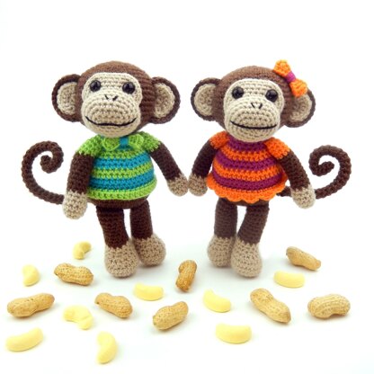 Mavis and Marvin are bursting with energy and love making their friends smile with their clever aerobic antics, so once you've crocheted yourself a pair of these merry monkeys be sure to take them to the park where they can burn off all that energy! Detailed written instructions and complimentary photos are included to help you along the way. Marvin and Mavis measure approx. 8" (21 cm) tall when using light worsted weight (DK/8 ply) yarn and a 3 mm hook (safety eye size 9 mm). The smaller monkeys pictured measure approx. 5 1/2" (14 cm) tall and use fingering weight (4 ply) yarn and a 1.75 mm hook (safety eye size 6 mm).