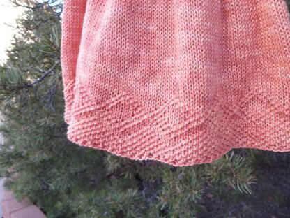 Top down construction, with a seed stitch front, a full princess skirt, and a pretty seed stitch hem pattern.