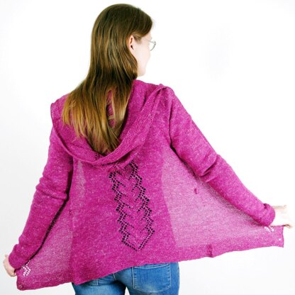 This raglan-sleeved cardigan is worked top down starting with the hood that’s shaped with short rows. The lace panel at the center back flows seamlessly down the hood, into the body of the garment, and then all the way to the garter stitch band at the hem.