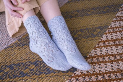 The Meadow socks are worked in the round, from the cuff to the toe. The pattern includes a written description of the pattern and charts.