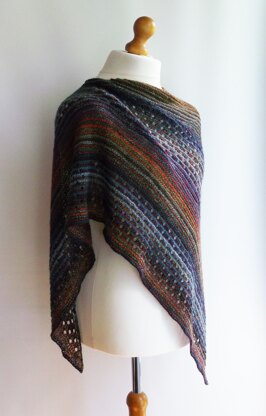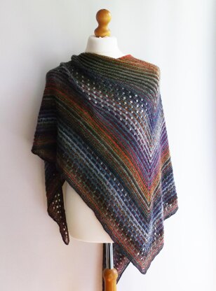 This top down shawl uses two different coloured balls of Debbie Bliss Rialto Luxury Sock yarn. Starting with a garter tab cast on, striped garter stitch sections seperate a simple eyelet pattern.